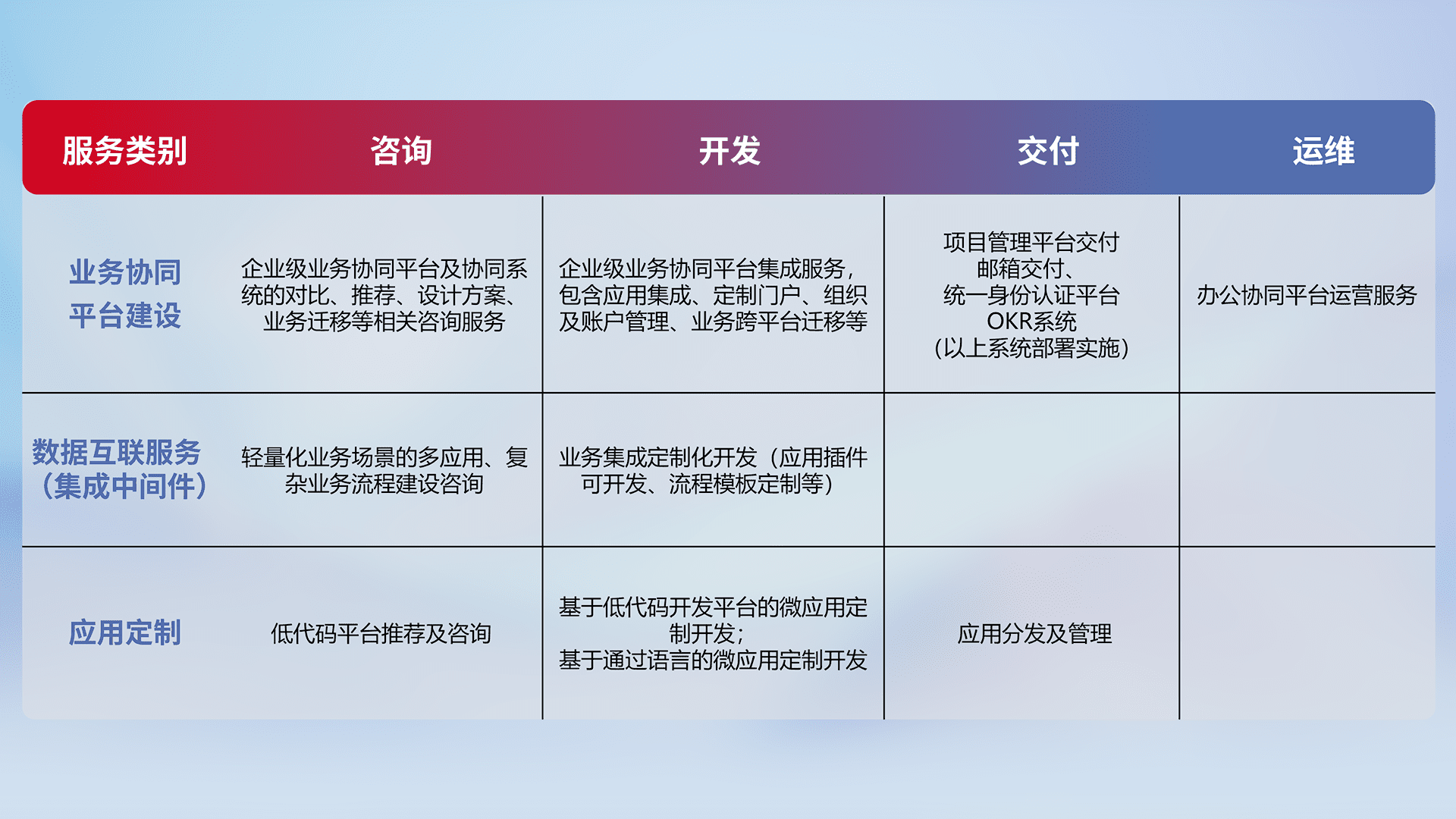 针对钉钉、、、企微、、、、IDaas等平台级产品提供产品的规划、、方案、、、交付、、、、定制化开发等服务,,,,实现如统一协同办公、、智能客户服务、、、混合会议管理、、、智能数据查询、、等业务场景,,,,实现数字化转型。。