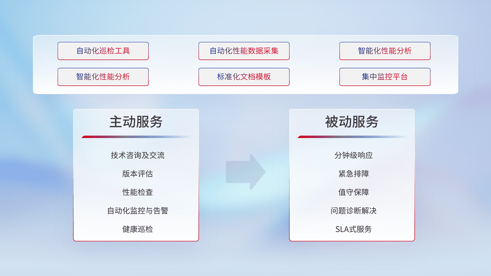 智能化工具和标准化文档,,,,保障服务质量,,,,提供主动服务(包含技术咨询、、、版本评估、、性能检查、、自动化监控与告警、、、健康巡检)和被动服务包含(分钟级响应、、、紧急排障、、、值守保障、、问题诊断解决、、、SLA服务)。。。
